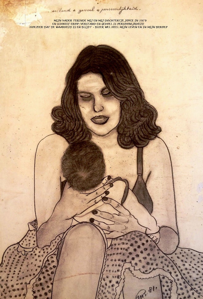 Mijn vader zaliger Henk van den Berg maakte in 1979 van een foto een prachtige houtskooltekening van mijn dochtertje en mij. Ik had net borstvoeding aan haar gegeven en kijk mijn baby aan, liggend op mijn schoot. Wat moet hij daar een plezier bij hebben gehad bij het maken van die 3 tekeningen. Zijn eerste kleinkind , zijn oudste kleindochter . Hoe trots en gelukkig was hij niet toen zij werd geboren. Die tekeningen waren het begin van zijn schilder carrière waar hij enorm veel plezier bij had om iets moois te maken. Vooral portretten waren zijn favoriete bezigheid waar hij uren en uren mee bezig kon zijn.
